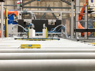There are two Kuka robots in the robot cell. Robot 1 picks up the centre piece from the stack and places it on the gluing station. The adhesive is applied there. It then picks up the centre piece again and places it on the conveyor belt. Robot two, meanwhile, picks up the two side pieces and places them on the conveyor belt as well. A machine glues the three parts together as a U-profile and the adhesive dries. Finally, robot 2 picks up the finished U-profile and places it on a pallet.