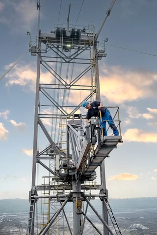 Since 2018, he has been working for the customer MIBRAG in various opencast mines, not only here in Schleenhain. He always starts work at 5:45 am. Together with two colleagues, he sets off after the work meeting to inspect and repair the facilities - and there are quite a few. The three fitters check around 5,400 objects for MIBRAG at the various opencast mines. These include over 150 crane systems and as many gate systems. Blumenbecker also inspects and repairs the 'small' equipment, such as 200 small hoists and over 1,400 load handling devices. ‘The tasks are many and varied. We have to work conscientiously and very precisely to ensure that all the equipment does its job reliably,’ explains Wiedemann.